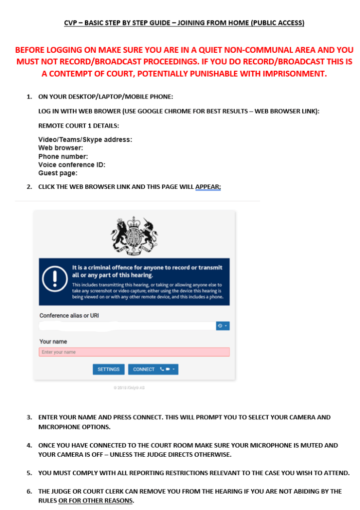 The phone number was written on the cause list and my call at 09.29 this morning resulted in an e-mail some four minutes later with a link to join the hearing contained within a step-by-step guide: