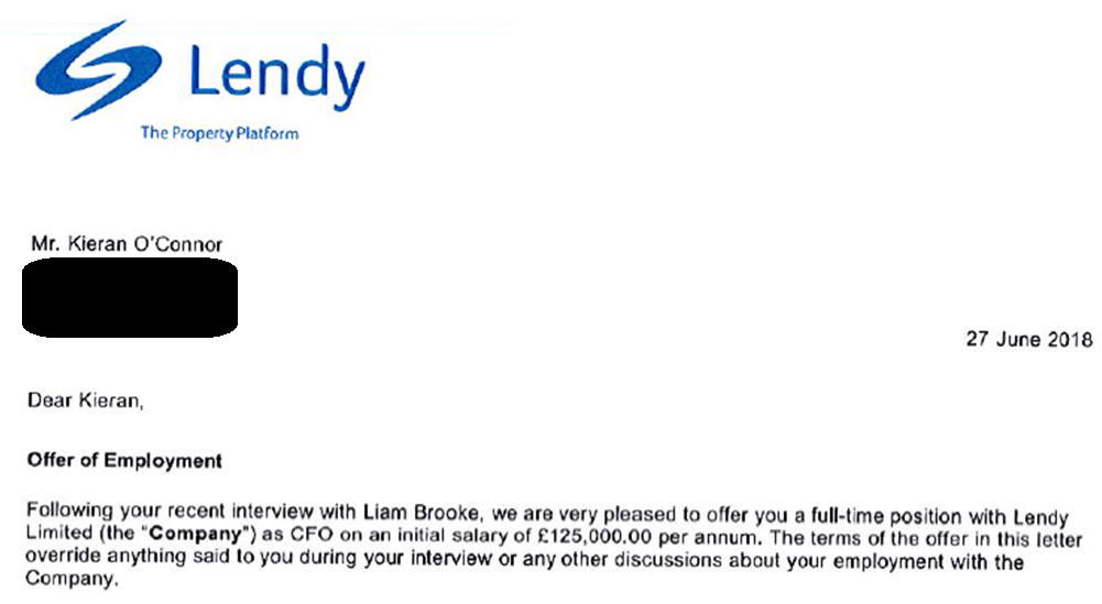 Kieran O’Connor, 56, was appointed as CFO at the FCA regulated firm Lendy in June 2018, and was dismissed in November of the same year.