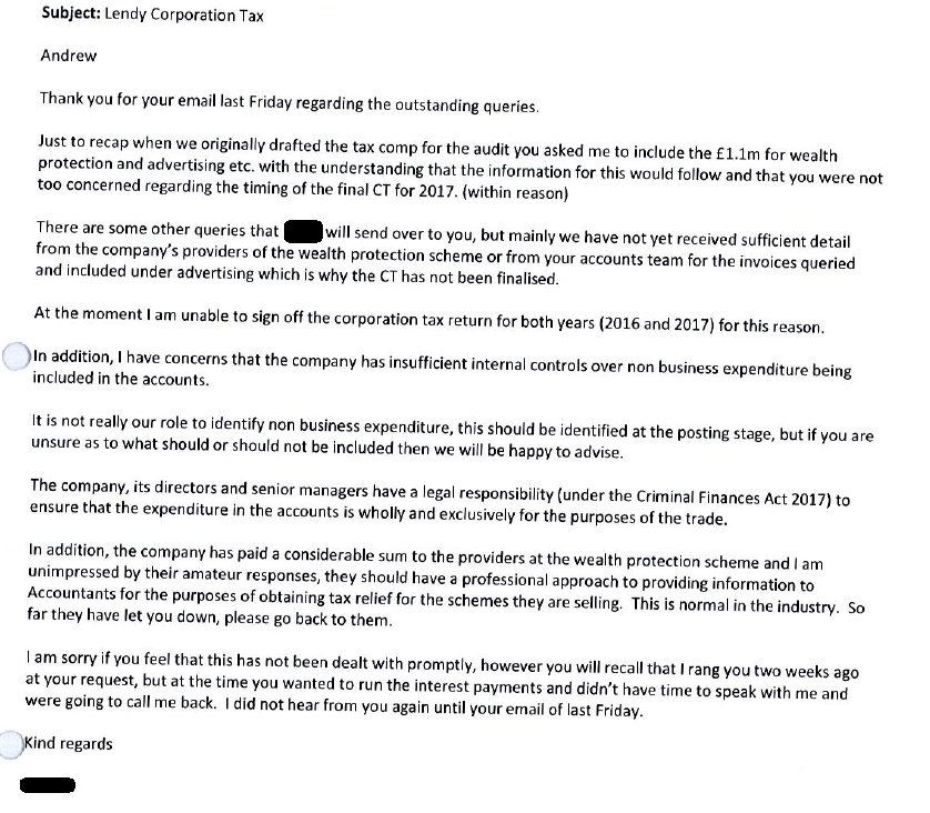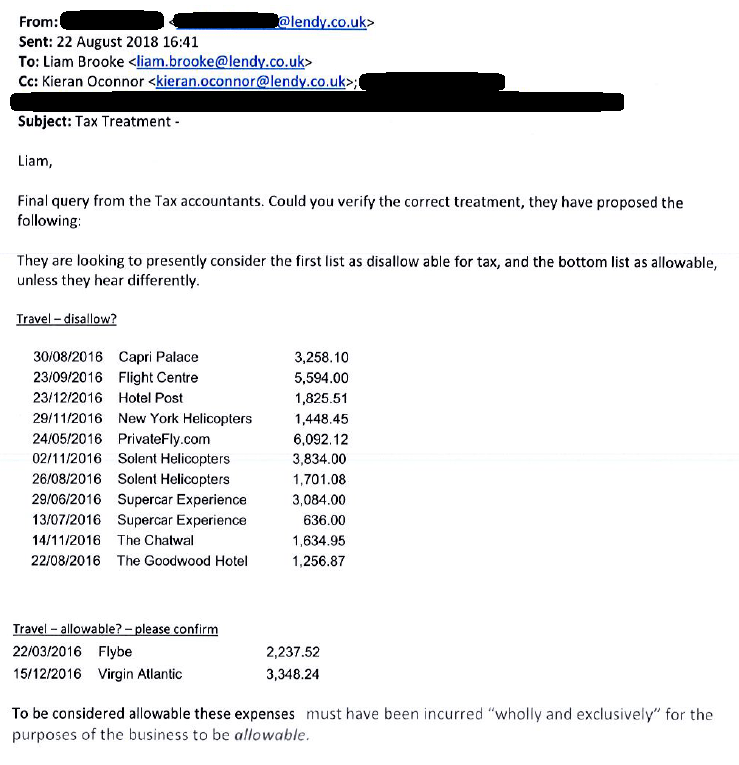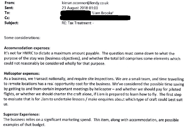 “When I gave Liam Brooke some examples of theoretical cases, Liam Brooke simply passed those to Lendy’s tax adviser, telling the tax adviser that the situations I’d described were precisely the context in which these expenses had been incurred.