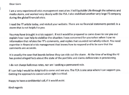 Mr Bellringer said there had been a letter authored by Mr O’Connor which contained what he believed “several inaccurate and potentially misrepresentative statements“, and an email exchange with the FCA about investors that was published without prior FCA approval.