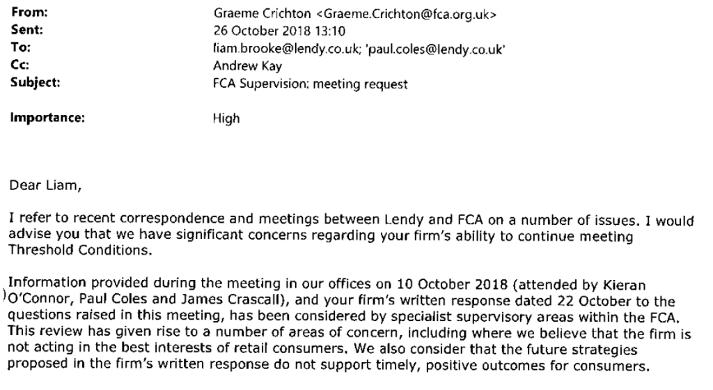 The FCA’s response was, we consider quite illustrative, it shows the FCA have systemic and wide-ranging concerns about the major issues involved with the company the threshold conditions, the appropriate resources, suitable conditions, it says information was provided in the meeting and the response give rise to a number of areas of concerns including if Lendy was acting in the best interests of retail consumers