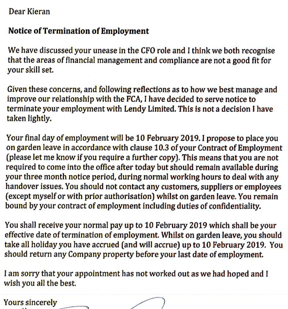 In any event “by the end of October 2018 the claimants role was effectively redundant… [Lendy] was no longer a company with any real future, it need skills involving FCA crisis management that were not … in the claimants forte.“