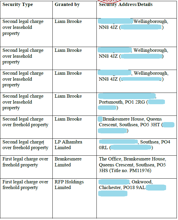 Likewise, filings for RFP Holdings Limited (director Sara Bryce-Gordon, 38) reveal a charge has been registered over the property at Ryefield Park.