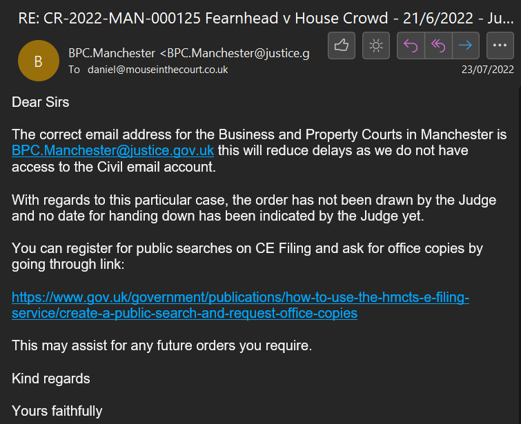 So the wrong e-mail was on the cause list. And I note that the CE-File entry for this case doesn’t exist. Unprompted I receive another e-mail the following week.