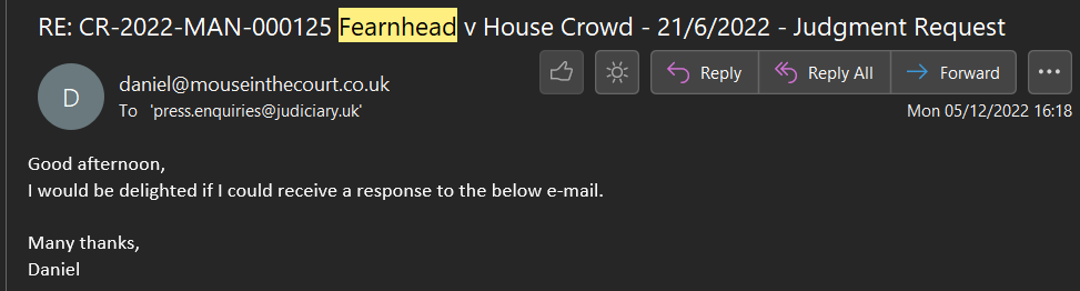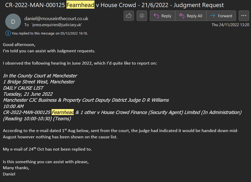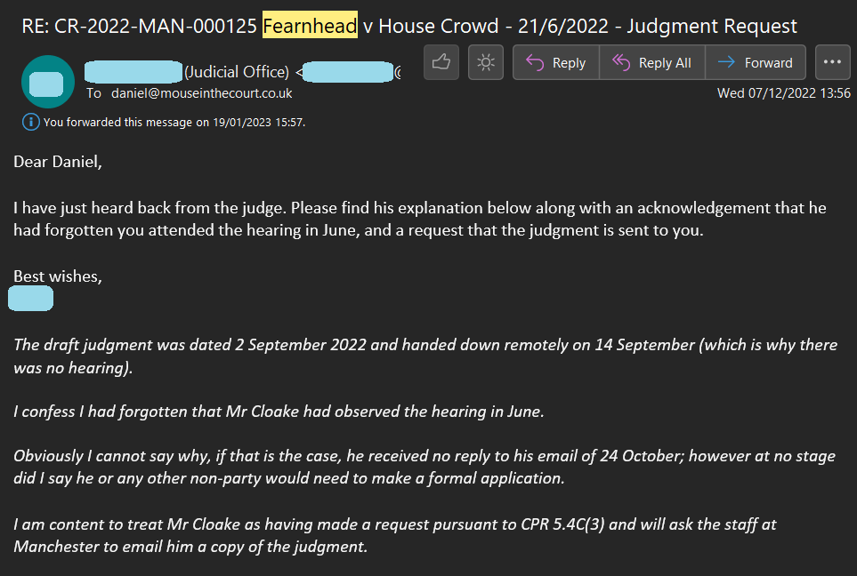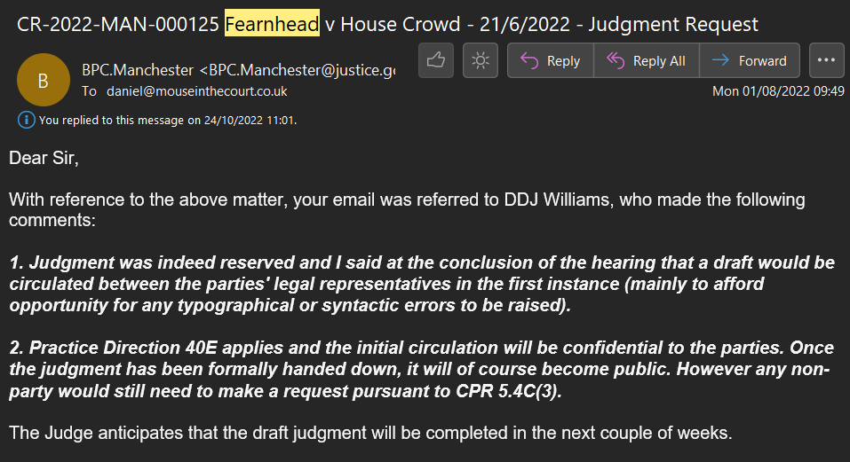 A reserved judgment, e-mailed in secret to the parties, was only disclosed to the mouseinthecourt some 140 days after being handed down.