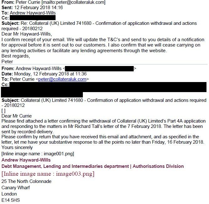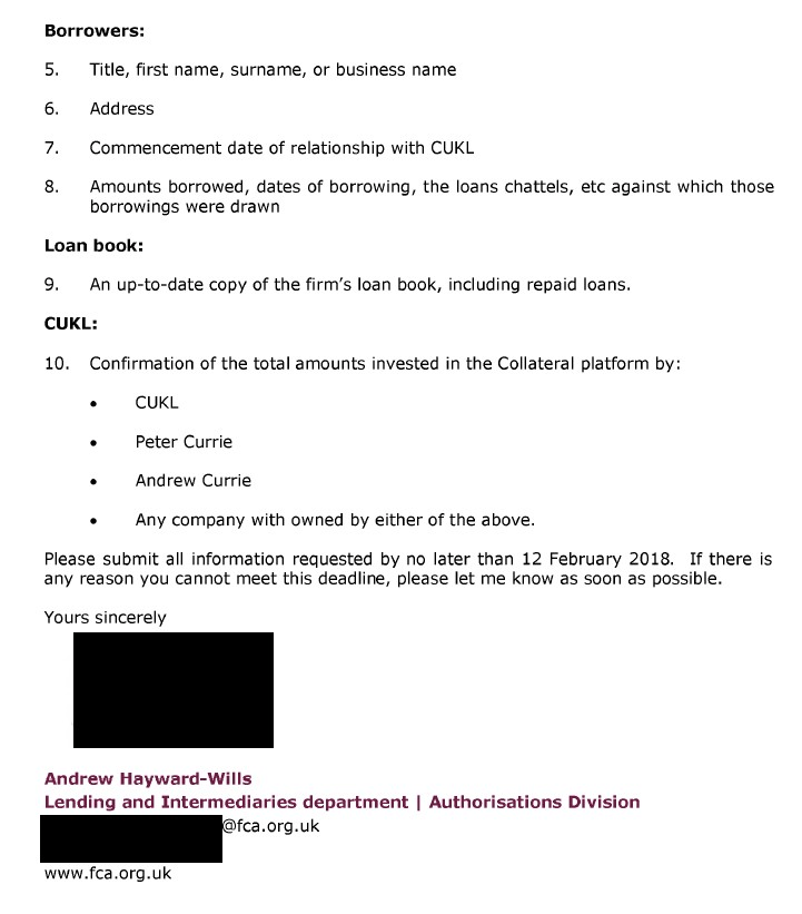 On the 13th February the FCA chased up their request for information about the investors. “Dear Mr Currie, further to my email of yesterday please can you provide an explanation of when you’ll provide the client data requested in my emails of 29 and 31 Jan 2018.”