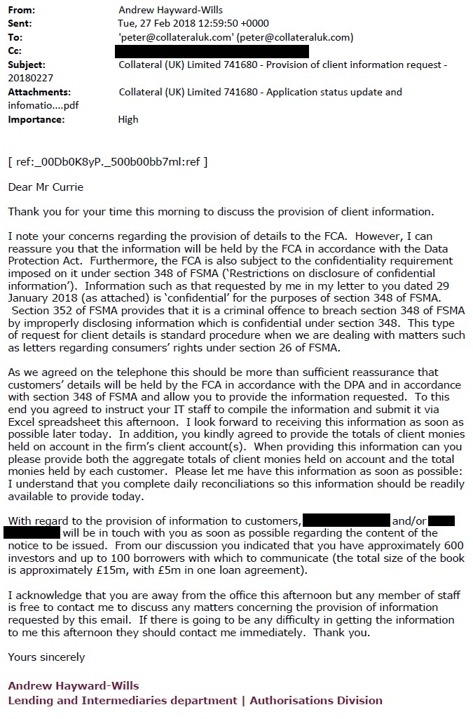A response was sent from the FCA on 27th February: ‘I can assure you that the information will be held by the FCA in accordance with the Data Protection Act’.