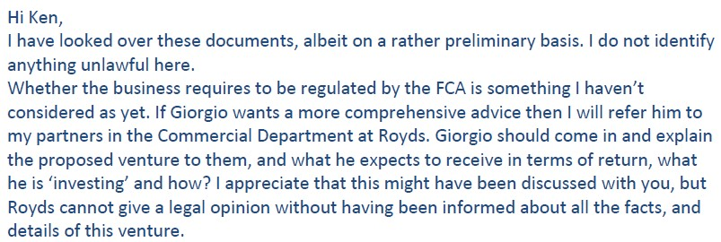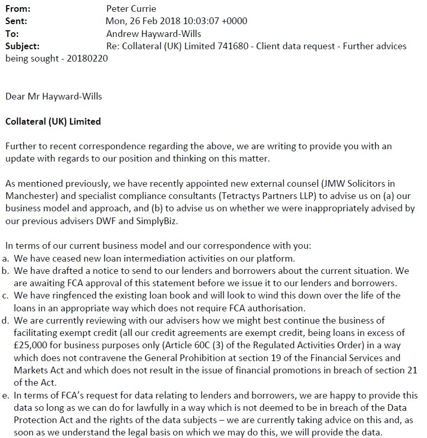 Peter Currie forwarded on advice from JMW to the FCA on 26th February 2018.