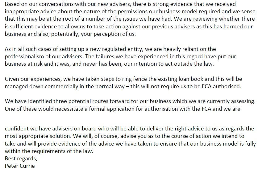 Peter Currie said he wanted to put up a notice on the website and asked the FCA for permission: I asked “can you please let us put that notice up on the website, and it took them 18 days to approve it.”