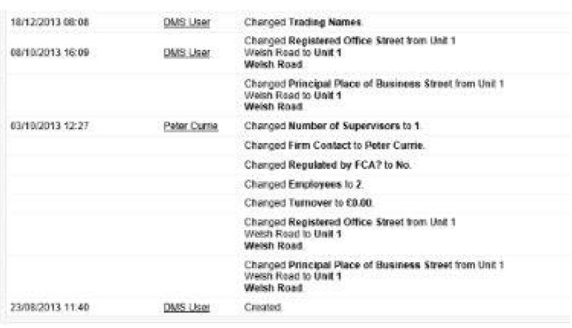 FCA audit log for the period between 23/08/2013 and 18/12/2013