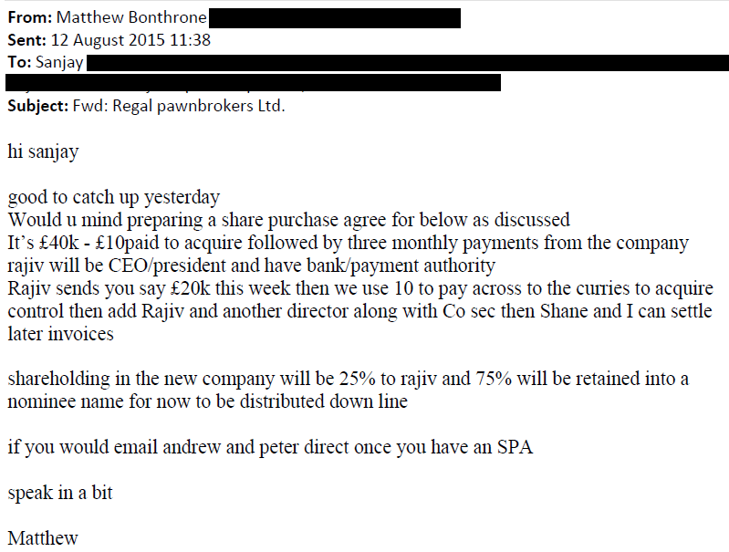The court was would that Matthew Bonthrone was planning on buying Regal. He had sent an e-mail asking his solicitors to draw up a ‘share purchase agreement’.