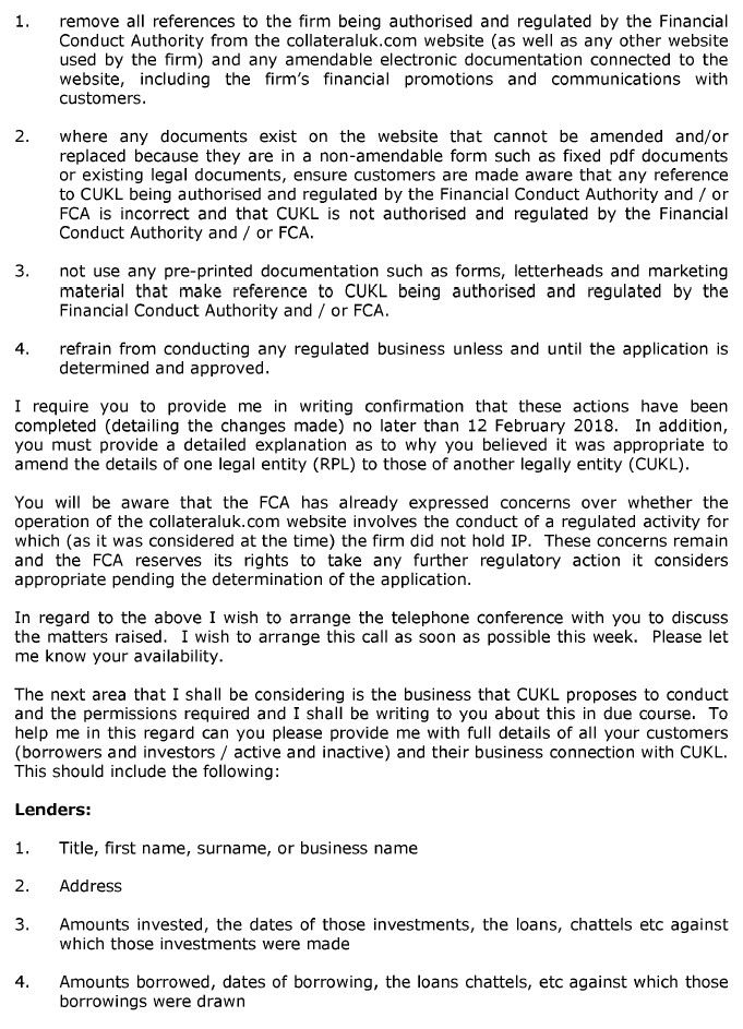 On the 13th February the FCA chased up their request for information about the investors. “Dear Mr Currie, further to my email of yesterday please can you provide an explanation of when you’ll provide the client data requested in my emails of 29 and 31 Jan 2018.”