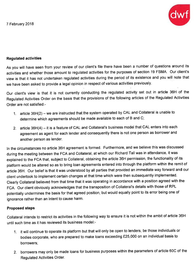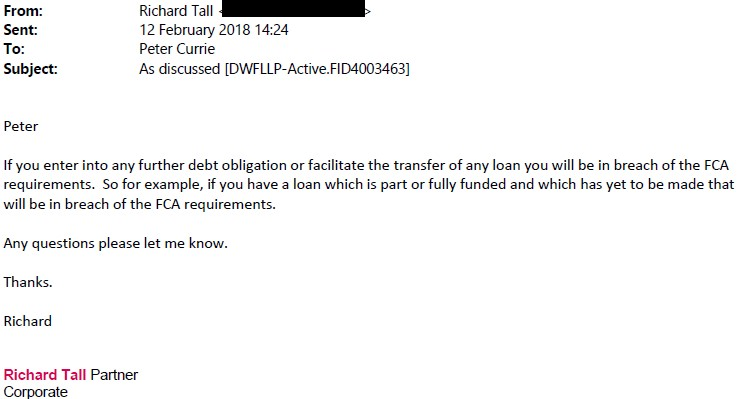 Peter Currie forwarded on advice from JMW to the FCA on 26th February 2018.