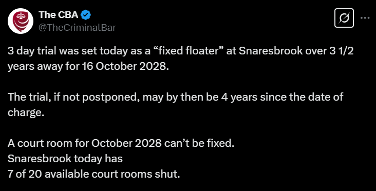 The Criminal Bar Association drew attention to the fact that on the day “a court room for October 2028 can’t be fixed … 7 [out] of 20 available court rooms [are] shut.“