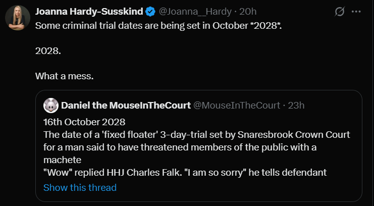 In response to the news about this 2028 trial date being tweeted the host of Radio 4’s You Do Not Have to Say Anything and criminal defence barrister Joanna Hardy-Susskind, said “What a mess.“