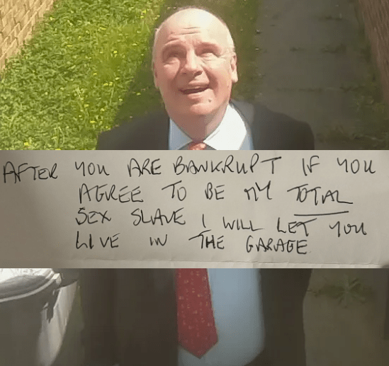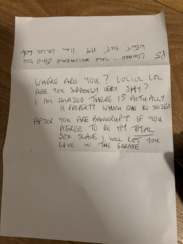 On this visit he posted me a handwritten note. It read variously that “AFTER YOU ARE BANKRUPT IF YOU AGREE TO BE MY TOTAL SEX SLAVE I WILL LET YOU LIVE IN THE GARAGE”