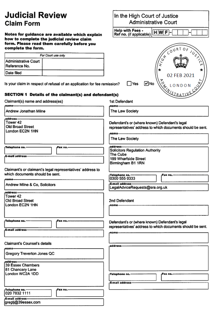 Shortly after the first Judicial Review was filed so was a second… described as ‘closely related’ in the regulators response dated 12th April 2021, which again repeated the claim that ‘the SRA has been hampered in progressing its investigation due to the volume of correspondence and complaints [Milne] has made’.