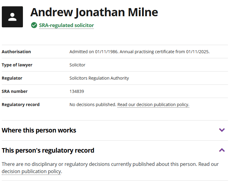 We can reveal that the Solicitors Regulation Authority, which purports to maintain the high standards of more than 200,000 legal professionals in England and Wales, has been investigating complaints about Andrew Milne’s behaviour at least as early as 2016, and received threats of an injunction, to prevent them from taking formal action, in 2021.