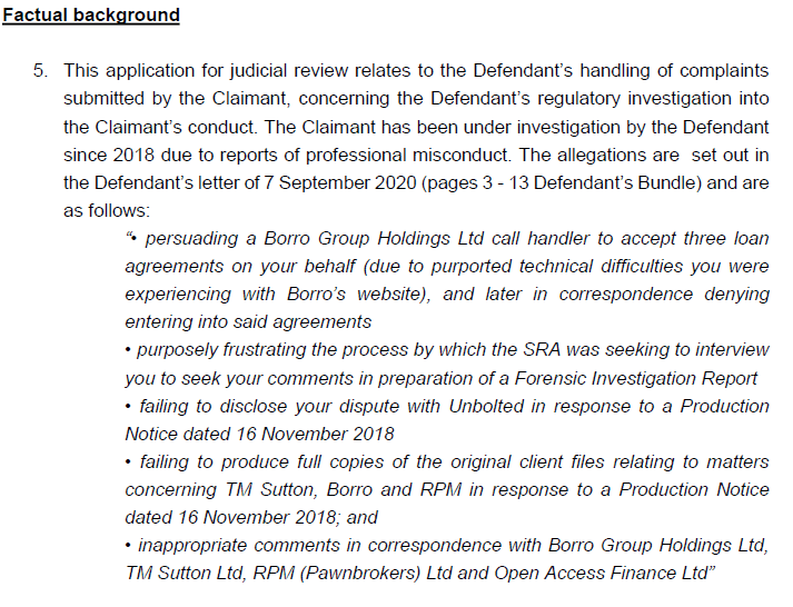 In a fourteen-page statement of grounds Milne explained that the SRA had been contacted by two firms of solicitors who were acting for Borro Group Holdings Limited. The two firms had objected to correspondence sent by Milne.
